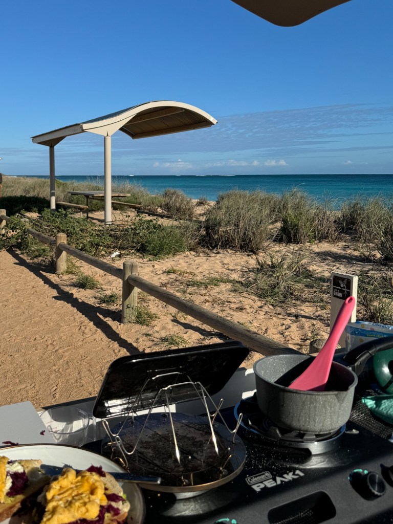 As the morning rolls on, yoga mats are rolled out, and tailgates are opened as travellers prepare to breakfast. The wind is light this morning, barely noticeable were it not for the slight sway in the grass bushes that hold the dune together. The ocean is a soft blue, and calm, for now. My coffee is on the boil, and I change into my swimsuit for my morning bathe. My coffee is poured, and because I drink it black, I capitalise on the cooling down period with my first swim for the day.